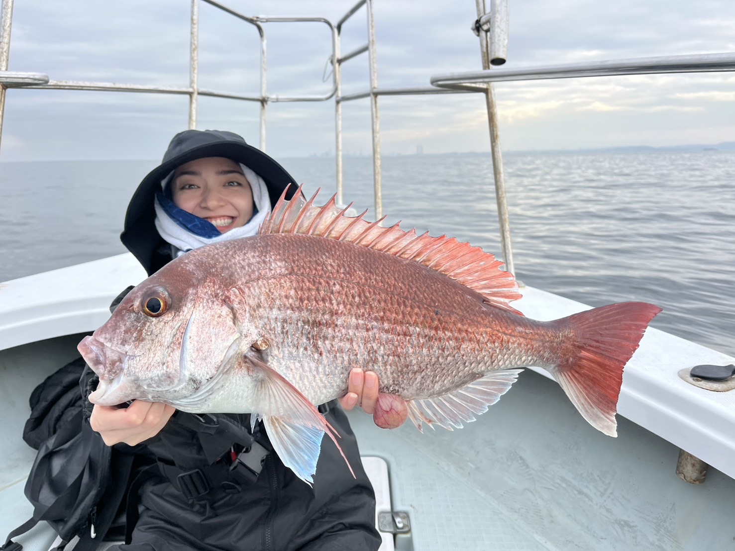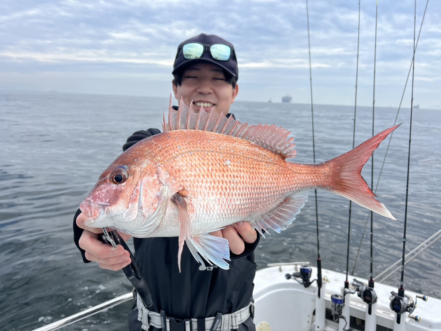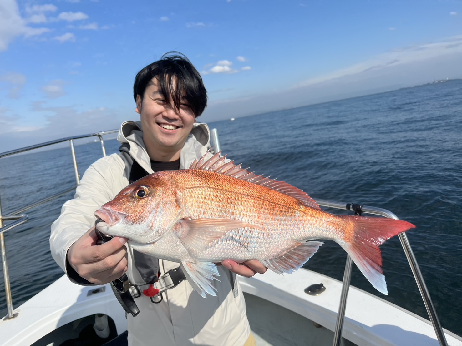地合いにコンポタ食べたいと言う→お説教→真鯛釣る